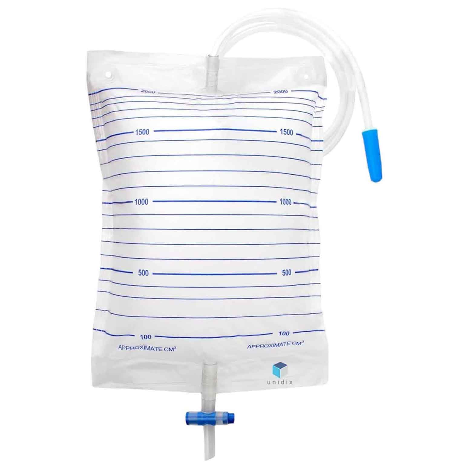 Las bolsas de orina de orina Unidix son transparente y de PVC, con 2L de capacidad, está diseñada para una recogida y medición de orina segura y precisa. Ofrece un grifo de vaciado que permite la extracción sin desconectar la sonda, una válvula antireflujo para mayor higiene y una escala medidora visible El tubo de 90cm y los ojales de sujeción facilitan su uso y colocación, siendo ideal para fines terapéuticos o diagnósticos.